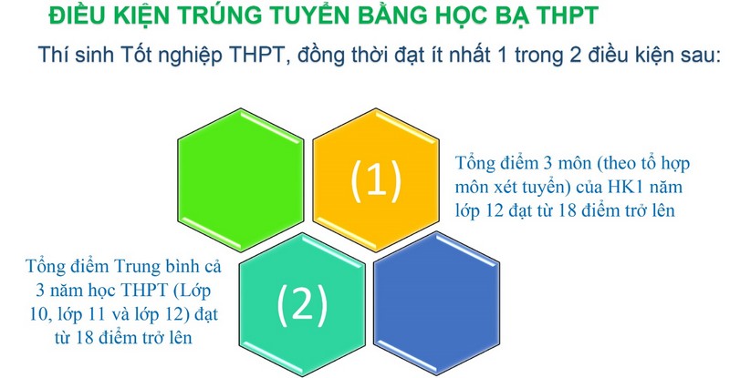 - Thí sinh đăng ký xét tuyển bằng học bạ bằng ĐTB 3 năm lớp 10,11,12 thì ĐTB năm lớp 10 + ĐTB năm lớp 11 + ĐTB năm lớp 12 + Điểm ưu tiên (nếu có) >= 18 điểm.