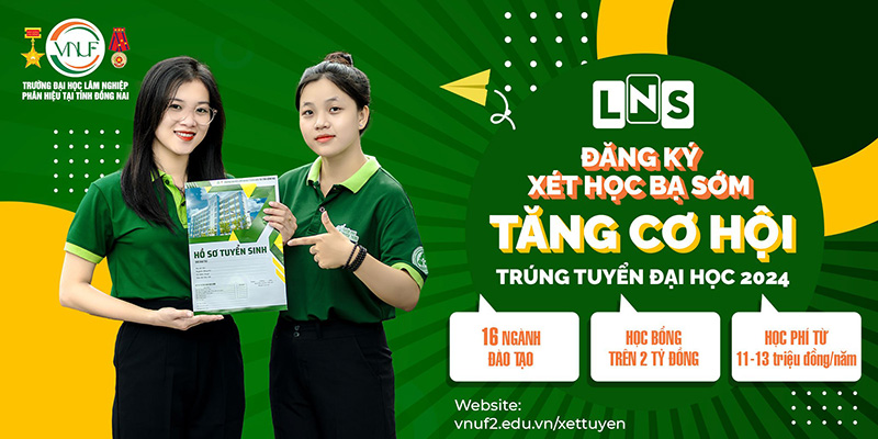 Đối với Phân hiệu trường Đại học Lâm nghiệp tại tỉnh Đồng Nai (VNUF2), thí sinh đang là học sinh lớp 12 sẽ có cơ hội xét tuyển sớm vào VNUF2 bằng phương thức xét học bạ theo tổ hợp môn của học kỳ 1 năm lớp 12 trong đợt nhận đăng ký xét tuyển đầu tiên từ 01/3/2024.