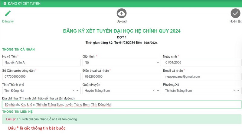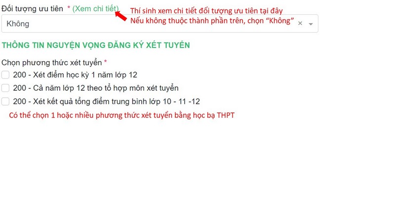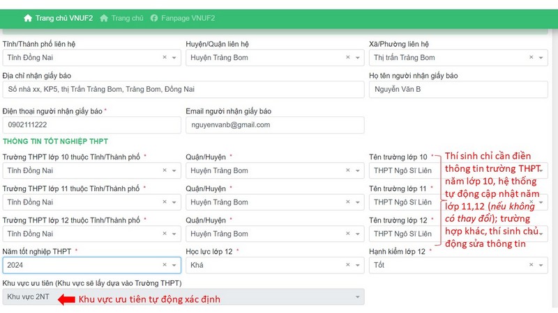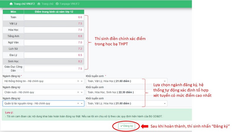 Thí sinh truy cập vào website http://xettuyen.vnuf2.edu.vn và điền đủ thông tin xét tuyển theo hướng dẫn: