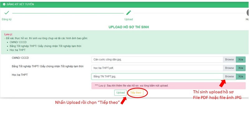 Thí sinh Chuẩn bị giấy tờ minh chứng gồm: Bản gốc hoặc bản photo công chứng Căn cước công dân; Học bạ THPT; Bằng tốt nghiệp THPT/ giấy chứng nhận tốt nghiệp tạm thời (Nếu có)