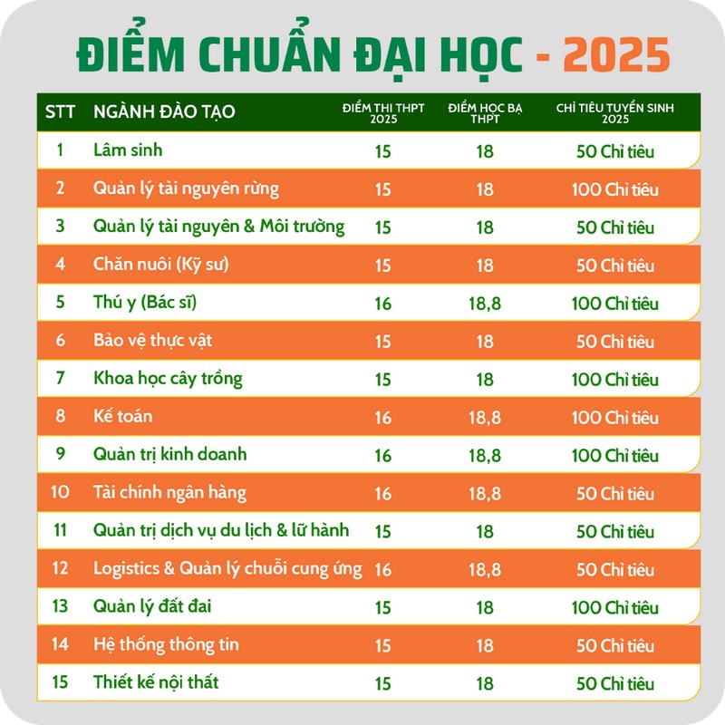 Phân hiệu Trường Đại học Lâm nghiệp tại tỉnh Đồng Nai (VNUF2) trân trọng thông báo điểm chuẩn trúng tuyển Đại học chính quy năm 2025 như sau: