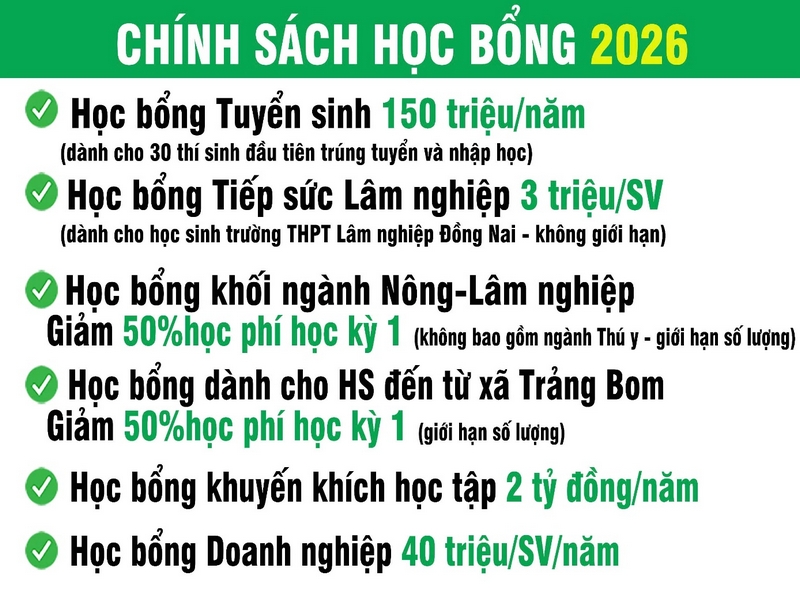 Năm 2026, Phân hiệu trường Đại học Lâm nghiệp tại tỉnh Đồng Nai (VNUF2) dự kiến tuyển sinh 1.000 chỉ tiêu trình độ Đại học chính quy cho 15 ngành đào tạo theo 03 phương thức xét tuyển gồm: