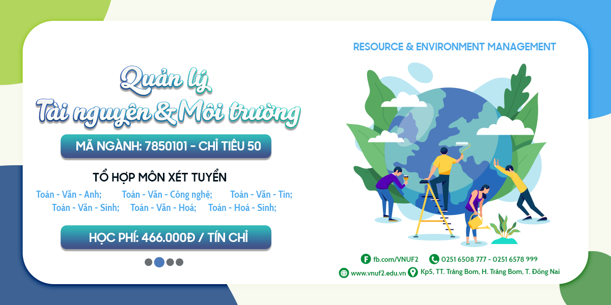 • Chương trình đào tạo ngành Quản lý tài nguyên và môi trường trang bị cho sinh viên những kiến thức chuyên sâu về các tài nguyên thiên nhiên như: khoáng sản và năng lượng, đất, nước, không khí, rừng, đa dạng sinh học… Học về quản lý ô nhiễm môi trường, quy hoạch môi trường, luật và chính sách tài nguyên môi trường, đánh giá tác động môi trường, công nghệ xử lý chất thải.