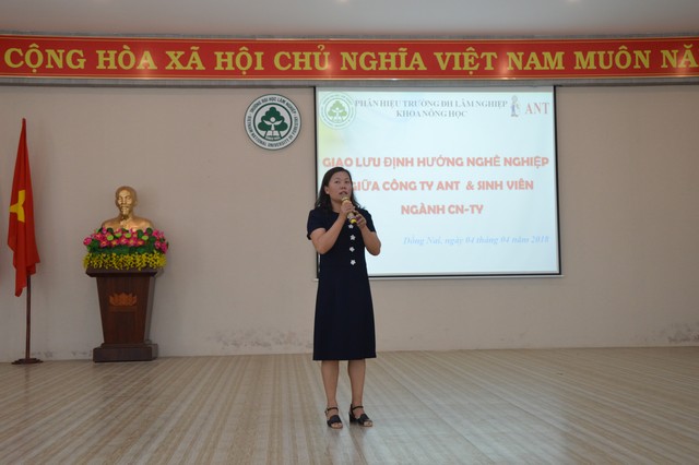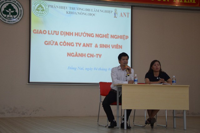 Thay mặt Công ty ANT ông Nguyễn Hân đã có những thông tin rất bổ ích cho sinh viên ngành chăn nuôi thú y về hành trang mà sinh viên cần trang bị cho mình khi đi thực tập tốt nghiệp và chia sẻ về tình hình ngành chăn nuôi hiện nay và trong tương lai sẽ có nhiều thay đổi. Đồng thời đại diện công ty đã tập trung giải đáp rất nhiều những băn khoăn và lo ngại của sinh viên về tình hình việc làm trong thời gian tới, đặc biệt là tình hình ngành chăn nuôi trong thời gian gần đây và trong tương lai tới. Bên cạnh đó, phía công ty cũng đã những thông tin chính thống về cơ hội việc làm dành cho sinh viên sau khi ra trường trong tương lai.