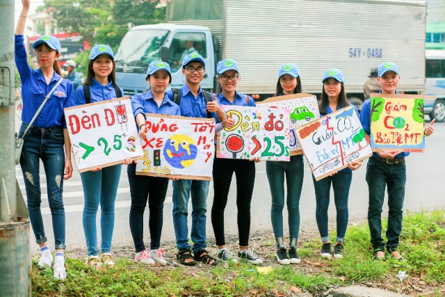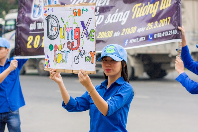 Sau gần 1 tuần thực hiện thiết kế những bảng khẩu hiệu cổ động ý nghĩa, súc tích ấn tượng, các thành viên phân công nhau trực tại các giao lộ có lượng xe máy lưu thông lớn trên toàn địa bàn thành phố vào các giờ cao điểm từ 6h30’ đến 8h00’ các ngày trong tuần. Cùng bảng hiệu trên tay, mỗi nhóm từ 5 đến 10 tình nguyện viên hô vang các khẩu hiệu ủng hộ hành động tắt máy xe và niềm nở hướng dẫn, lý giải về dự án cho người đi đường có thắc mắc, giúp họ hiểu biết rõ hơn khi cùng tham gia thực hiện.