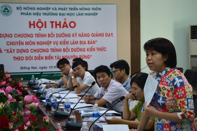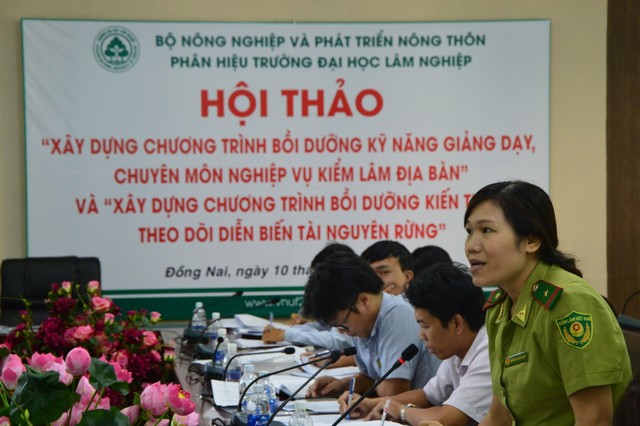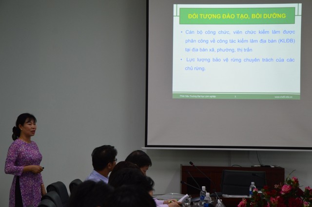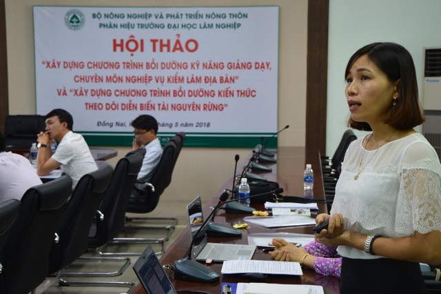 Tại buổi Hội thảo, Ths. Vũ Thị Lan đã báo cáo Đề cương chương trình bồi dưỡng kỹ năng giảng dạy, chuyên môn nghiệp vụ kiểm lâm địa bàn; TS. Nguyễn Thị Hà báo cáo chương trình bồi dưỡng kiến thức theo dõi diễn biến tài nguyên rừng.