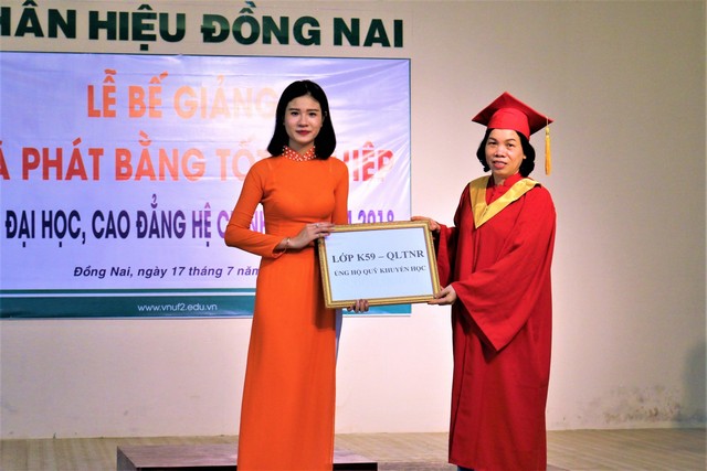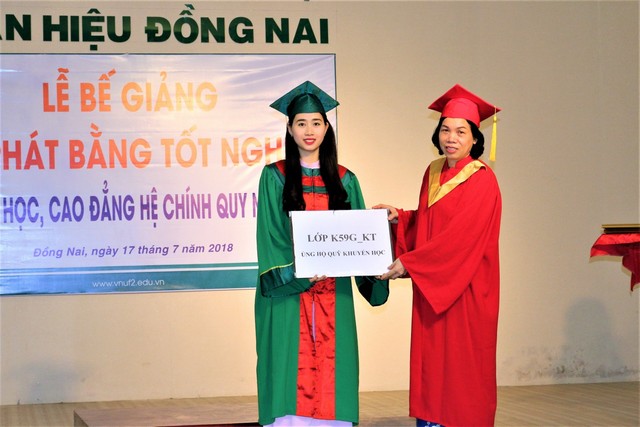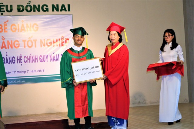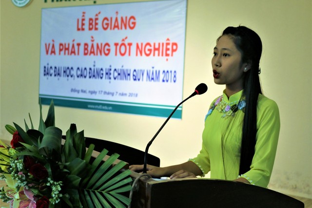 Cũng tại buổi Lễ, tân kỹ sư ngành Công nghệ chế biến lâm sản, chị Trần Thị Việt Trinh đại diện cho toàn thể các tân cử nhân/ kỹ sư nhận bằng tốt nghiệp phát biểu tri ân tới Nhà trường và quý thầy, cô. Để bày tỏ sự tri ân đối với tập thể quý thầy cô Nhà trường; đồng thời nhằm góp phần tiếp sức cho những sinh viên có hoàn cảnh khó khăn, tập thể các lớp K59G_QLĐĐ; K59G_KT; K59D_KHMT; K59H_QLTNR; C04_QLTNR đã tặng quỹ khuyến học Nhà trường (tổng số tiền là 9.000.000 đồng, trong đó tân kỹ sư Nguyễn Trọng Ân – ngành QLĐĐ ủng hộ 4.000.000 đồng).