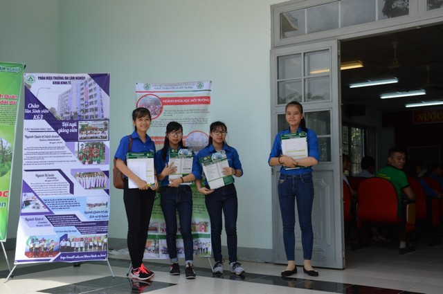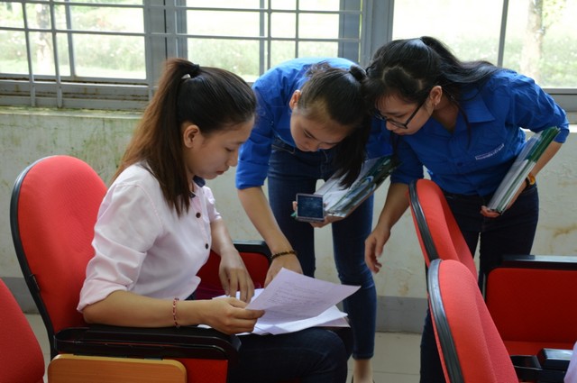 Các bạn Sinh viên tình nguyện, sinh viên xung kích hướng hỗ trợ tân sinh viên và người thân làm thủ tục nhập học