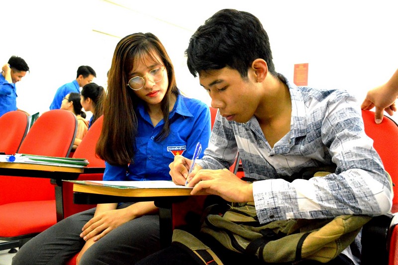 Các bạn Sinh viên tình nguyện, sinh viên xung kích hướng hỗ trợ tân sinh viên và người thân làm thủ tục nhập học
