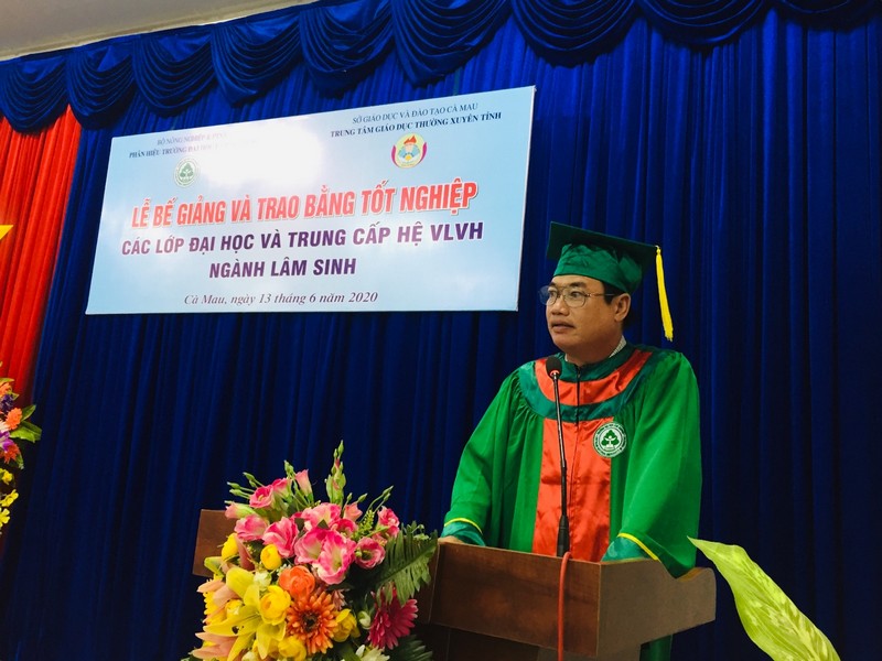 Trong diễn văn trọng thể tại buổi Lễ, thay mặt Ban Giám đốc nhà trường Thầy Mai Hải Châu, Phó giám đốc đã có lời phát biểu ân cần, dặn dò, động viên, khích lệ đối với các tân cử nhân, tân kỹ sư tốt nghiệp và gửi lời cảm ơn tới các thầy cô giáo, các phòng, khoa trong nhà trường, gia đình các tân cử nhân , kỹ sư đã hỗ trợ, đồng hành cùng Nhà trường trong suốt thời gian dài để các học viên, sinh viên có được kết quả như ngày hôm nay; Đồng thời thầy Phó Giám đốc cũng mong muốn rằng, các tân cử nhân, tân kỹ sư phải luôn phát huy được truyền thống tốt đẹp của sinh viên trường Đại học Lâm nghiệp Việt Nam anh hùng, có ý thức tự học liên tục, mạnh dạn và sáng tạo ứng dụng những kiến thức đã học vào thực tế, khiêm tốn và chủ động học hỏi đồng nghiệp, những người đi trước để làm giàu thêm kiến thức của bản thân, rút ngắn khoảng cách một cách nhanh nhất kiến thức sách vở với thực tiễn.