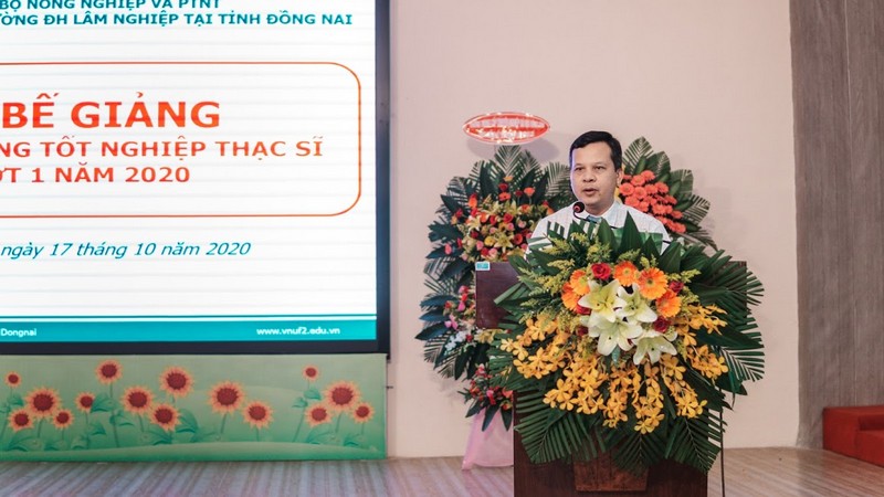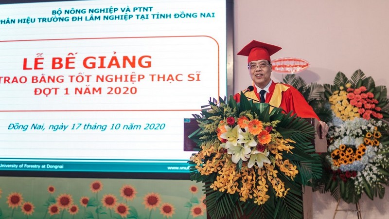 NGND.GS.TS. Trần Văn Chứ thay mặt Đảng ủy – Hội đồng trường – Ban Giám hiệu phát biểu chúc mừng 150 tân Thạc sỹ được công nhận tốt nghiệp đợt 1 năm 2020. Thầy Hiệu trưởng đánh giá cao về sự tin tưởng của Gia đình, cá nhân người học về Nhà trường và đã lựa chọn Trường ĐHLN là môi trường học tập, nghiên cứu. Thầy khẳng định chính người học là cầu nối thông tin tốt nhất và quảng bá hình ảnh nhà trường đến với cộng đồng và xã hội. Thầy cũng tin tưởng 150 tân Thạc sỹ hôm nay sẽ bổ sung nguồn lực chất lượng cao về trí tuệ, sức trẻ, tinh thân nhiệt huyết cho các địa phương khu vực phía nam để phát triển KT – XH – KHCN trong tương lai và Nhà trường luôn chào đón các tân Thạc sỹ ở bậc học cao hơn trong thời gian tới.
