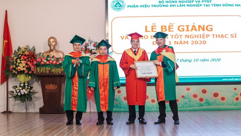 Để thể hiện sự biết ơn với nhà trường và cầu nối cho các thế hệ sau. Tập thể tân Thạc sỹ trao tặng 01 xuất học bổng trị giá 7.000.000 đồng cho quỹ Khuyến học, Khuyến tài của nhà trường nhằm giúp đỡ các em Sinh viên có hoàn cảnh khó khăn hoàn thành khóa học để trở thành công dân hữu ích. Ngoài ra tập thể tân Thạc sỹ các ngành cũng ủng hộ việc xây dựng quảng trường Sinh viên trường ĐHLN trị giá 10.000.000 đồng.