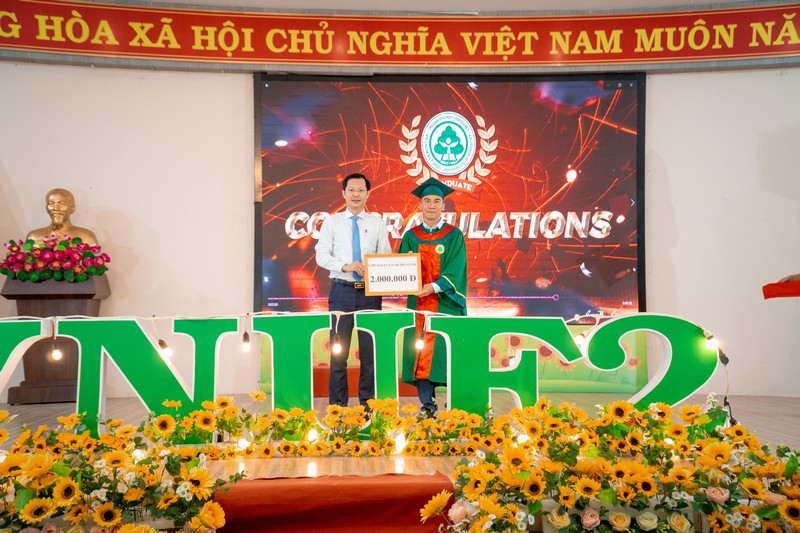 Đại diện cho 320 tân Kỹ sư tốt nghiệp, anh Đỗ Ngọc Phúc - chuyên ngành QLTNR phát biểu bày tỏ lòng biết ơn sâu sắc đến Tập thể Hội đồng sư phạm Nhà trường luôn quan tâm, tạo điều kiện để người học có được môi trường tốt nhất trong quá trình học tập, rèn luyện tại trường. Để bày tỏ sự tri ân đến Nhà trường đồng thời động viên, khích lệ các thế hệ người học sau này các tập thể trao tặng quỹ khuyến học Nhà trường tổng số tiền 15.000.000 đồng. Cũng qua bài phát biểu, anh Đỗ Ngọc Phúc bày tỏ quyết tâm sẽ luôn sẵn sàng góp sức mình để cống hiến cho lĩnh vực công tác, xứng đáng là những học viên được học tập, rèn luyện tại Phân hiệu Đồng Nai - xứng đáng với danh hiệu Huân chương Độc lập hạng Nhất của Nhà trường.