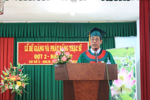Ngày 13/9/2012 tại Hội trường lớn, Nhà trường long trọng tổ chức Lễ bế giảng và trao bằng tốt nghiệp Thạc sỹ các ngành Lâm học, Quản lý bảo vệ rừng và Kinh tế Nông nghiệp cho 80 học viên khoá 17 và 18 của nhà trường. Về dự lễ bế giảng có PGS. TS Trần Văn Chứ - P. Hiệu trưởng nhà trường; PGS. TS Nguyễn Phan Thiết - Trưởng phòng Đào tạo Sau đại học; TS. Hoàn Xuân Niên - P. Giám đốc cơ sở 2; các thầy cô giáo là trưởng các đơn vị và toàn thể học viên đủ điều kiện nhận bằng.