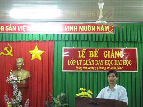 TS. Đinh Quang Tuyến đại diện cho các học viên phát biểu cám ơn lãnh đạo các nhà trường đã tạo điều kiện thuận lợi cho các học viên được tham gia lớp học, cám ơn quý thầy cô Trường Đại học Sư phạm Kỹ thuật thành phố Hồ Chí Minh đã nhiệt tình giảng dạy, hứa với lãnh đạo các nhà trường sẽ tiếp tục học tập nghiên cứu và vận dụng những kiến thức kỹ năng được trang bị vào trong công tác giảng dạy để hoàn thành tốt nhiệm vụ được giao.