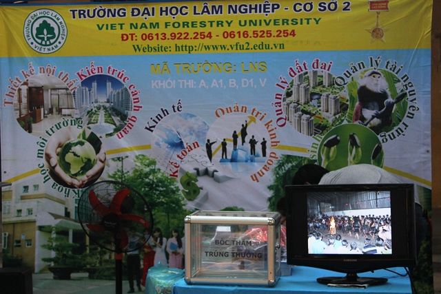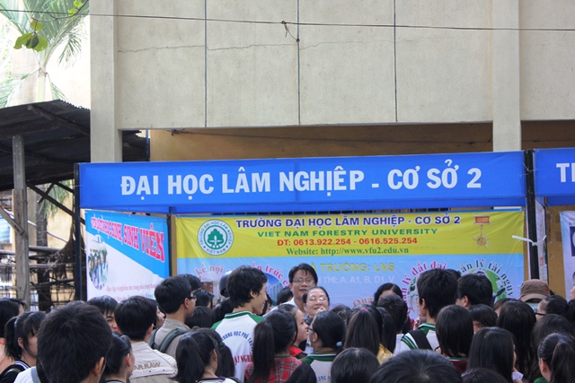 Ngoài việc tổ chức tư vấn trực tiếp trên truyền hình, ban tổ chức đã bố trí cho mỗi trường một gian hàng ngay tại sân trường nhằm giải đáp trực tiếp, chi tiết cho các em học sinh quan tâm đến Trường, Ngành mà mình dự kiến sẽ lựa chọn. Trường ĐH Lâm nghiệp là Trường ĐH Công lập có truyền thống gần 50 năm xây dựng và phát triển; mặt khác nhà trường đào tạo đa cấp, đa ngành nhiều ngành phù hợp với điều kiện kinh tế-xã hội tại địa phương. Đặc biệt, năm 2013 Trường ĐH Lâm nghiệp – Cơ sở 2 mở thêm ba ngành mới là Khoa học môi trường; Thiết kế nội thất và Kiến trúc cảnh quan, trong đó hai ngành Thiết kế nội thất và Kiến trúc cảnh quan sẽ thi khối V (năng khiếu vẽ) trong đó điểm môn thi năng khiếu được nhân hệ số 2, đây là cơ hội cho rất nhiều em muốn bước chân vào Trường ĐH. Mặt khác, là Cơ sở đào tạo Đại học đa cấp vì vậy các em nếu không trúng tuyển Đại học có cơ hội xét tuyển bậc Cao đẳng hoặc TCCN và sau đó Liên thông lên Đại học chính tại Trường ĐH Lâm nghiệp vì vậy được các em hết sức quan tâm, đặt nhiều câu hỏi và được tư vấn thoả đáng.