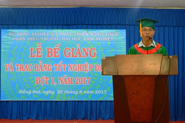 Đại diện cho toàn thể các anh, chị học viên, sinh viên nhận bằng tốt nghiệp, anh Nguyễn Tuấn Hoàng - lớp K4B_LTTC_QLTNR phát biểu tri ân tới Nhà trường và quý thầy, cô.