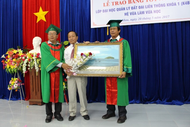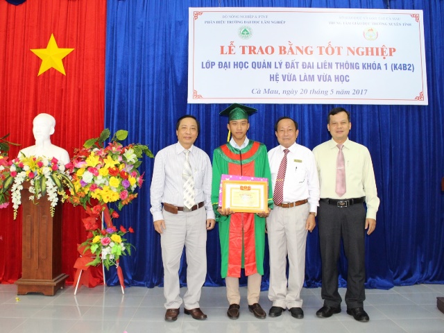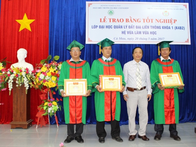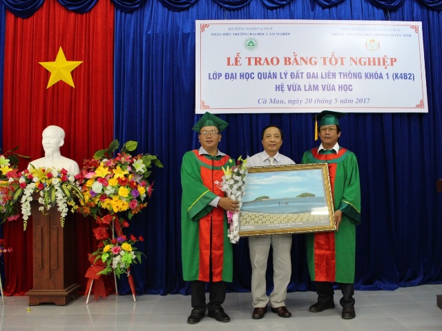 Sáng 20/5/2017 tại Trung tâm GDTX tỉnh Cà Mau. Phân hiệu Trường Đại học Lâm nghiệp phối hợp với Trung tâm GDTX tỉnh Cà Mau long trọng tổ chức Lễ Bế giảng và trao bằng tốt nghiệp các lớp Liên thông từ Trung cấp lên Đại học các ngành QLĐĐ; Kế toán hệ VLVH đợt tháng 5/2017.