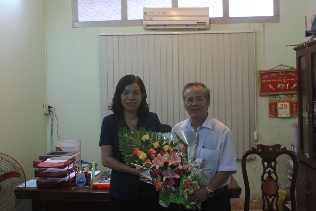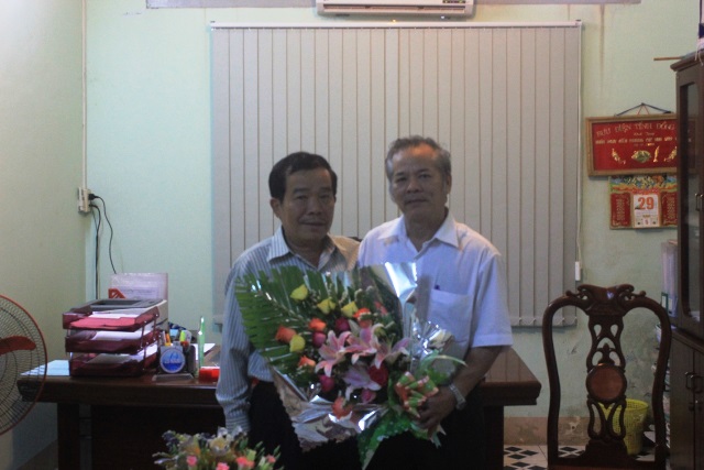 Thầy Phạm Bá Hanh tặng hoa và chụp hình lưu niệm cùng thầy Hồ Sĩ Tương