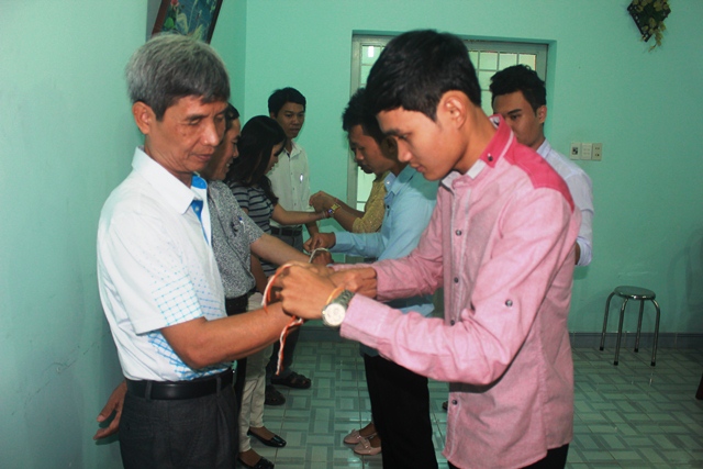 Các em SV Lào thực hiện hoạt đồng truyền thống: buộc chỉ cổ tay