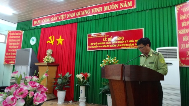 Dự lễ bế giảng lớp học có thầy Phạm Bá Hanh, Phó giám đốc; thầy Tưởng Quang Vinh Phó giám đốc; cô Vũ Thị Lan Giám đốc Trung tâm Đào tạo Bồi dưỡng công chức Kiểm lâm; trưởng các đơn vị trong nhà trường. Sau phần nghi thức buổi lễ, Lớp trưởng Vũ Quang Nam lên đọc Báo cáo tổng kết khóa học, với 100% các học viên đạt yêu cầu trong đó 15/26 học viên đạt loại Giỏi chiếm 57 %, số học viên còn lại đạt loại khá;