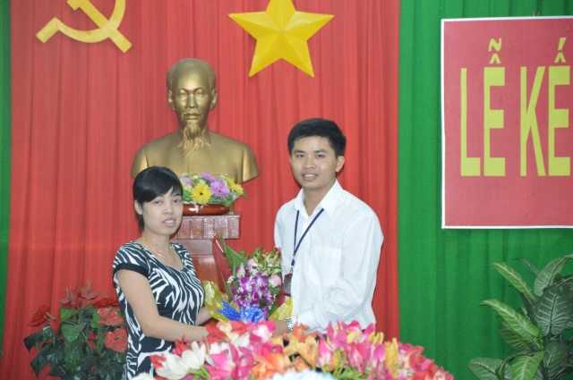 Quần chúng Nguyễn Thị Nhung tặng hoa chúc mừng đồng chí đảng viên mới