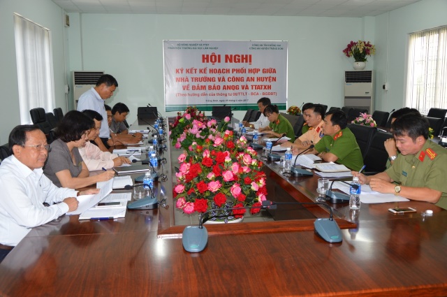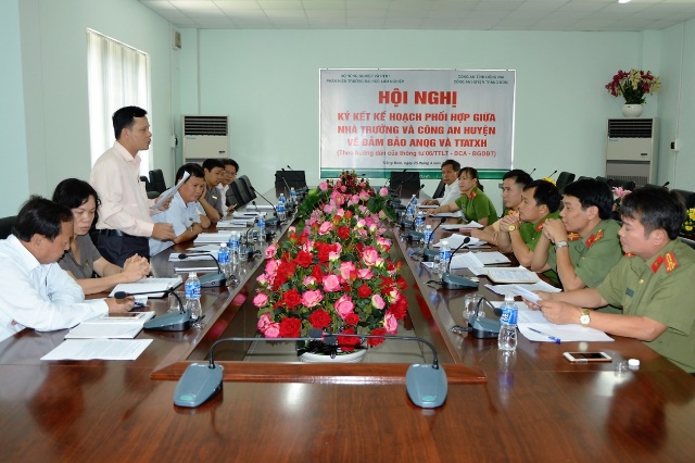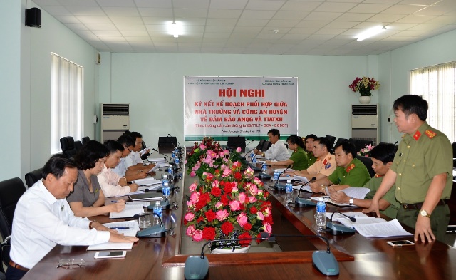 Công tác đảm bảo an ninh trường học là một trong những nhiệm vụ trọng tâm và xuyên suốt, góp phần xây dựng môi trường giáo dục lành mạnh, nâng cao chất lượng dạy và học Vì vậy, Hội nghị ký kết kế hoạch phối hợp giữa Nhà trường và Công an huyện Trảng Bom về đảm bảo ANQG và TTATXH là một sự kiện quan trọng, có ý nghĩa to lớn trong công tác phối hợp tổ chức tuyên truyền, giáo dục nâng cao nhận thức của cán bộ viên chức, lao động và học sinh sinh viên Nhà trường về chương trình hành động phòng chống ma túy, tệ nạn xã hội, phòng chống cháy nổ, an toàn giao thông và an ninh Tổ quốc.
