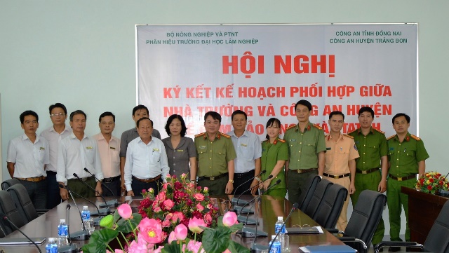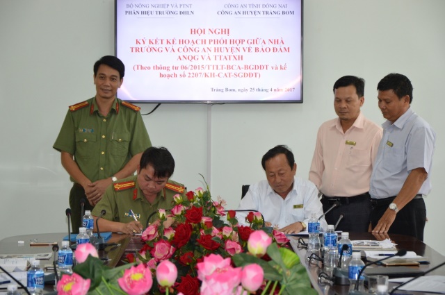 Thực hiện kế hoạch số 2207/KH-CAT-SGDĐT và Thông tư 06/2015/TTLT-BCA-BGDĐT, sáng ngày 25/4, tại phòng họp B (nhà A1) đã diễn ra Hội nghị ký kết Kế hoạch phối hợp giữa Phân hiệu Trường Đại học Lâm nghiệp và Công an huyện Trảng Bom về đảm bảo an ninh quốc gia (ANQG) và trật tự an toàn xã hội (TTATXH).