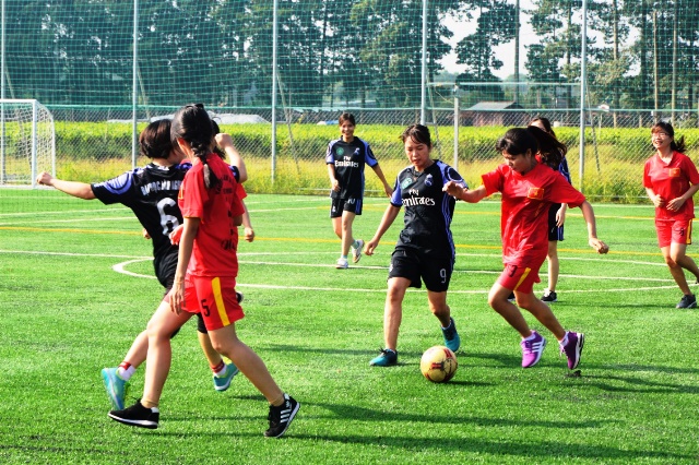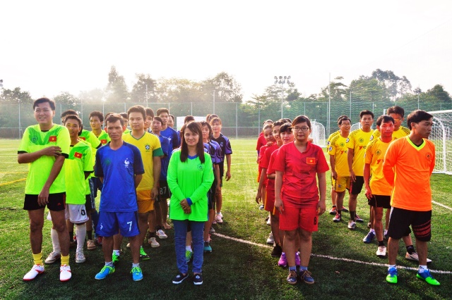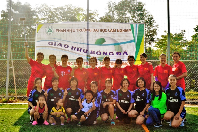 Trận giao hữu giữa đội bóng nữ Khối văn phòng (áo đỏ) và đội Khối giảng viên (áo tím đen)