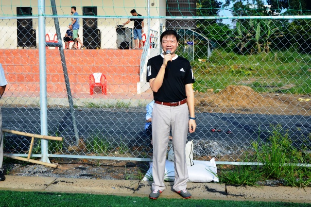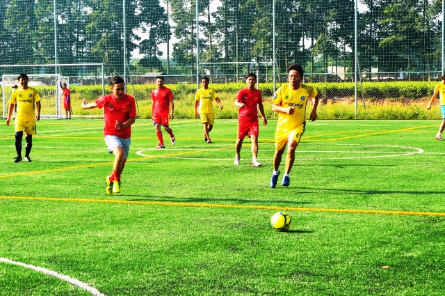 Trận giao hữu giữa đội nam Khối văn phòng (áo vàng) và Khối giảng viên (áo đỏ) trên 35