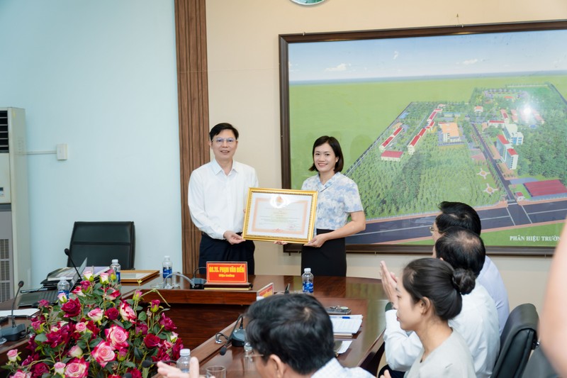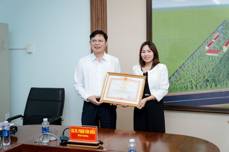 Tại buổi làm việc GS.TS. Phạm Văn Điển đã trao bằng khen của Thủ tướng Chính Phủ cho TS. Nguyễn Thị Hà – Trưởng khoa Tài nguyên - môi trường và ThS. Đỗ Thị Thắm – Trưởng Phòng Tài chính kế toán đã có thành tích xuất sắc trong thực hiện nhiệm vụ.