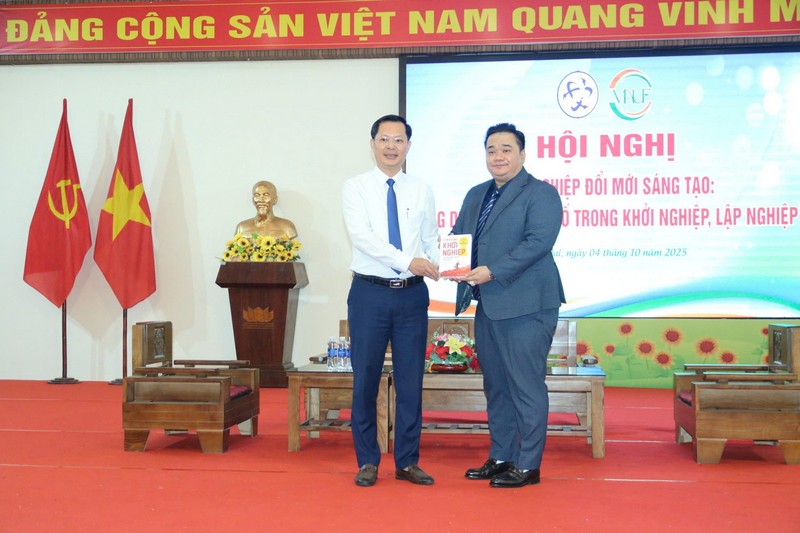 Ông Nguyễn Duy Khương (bên phải) - Phó Chủ tịch Hội Doanh nhân trẻ Đồng Nai trao tặng cuốn sách “Con đường khởi nghiệp và những điều cần biết” cho ông Nguyễn Sỹ Hà – Bí thư Đảng ủy, Phó Giám đốc phụ trách Phân hiệu Trường Đại học Lâm nghiệp tại Đồng Nai.