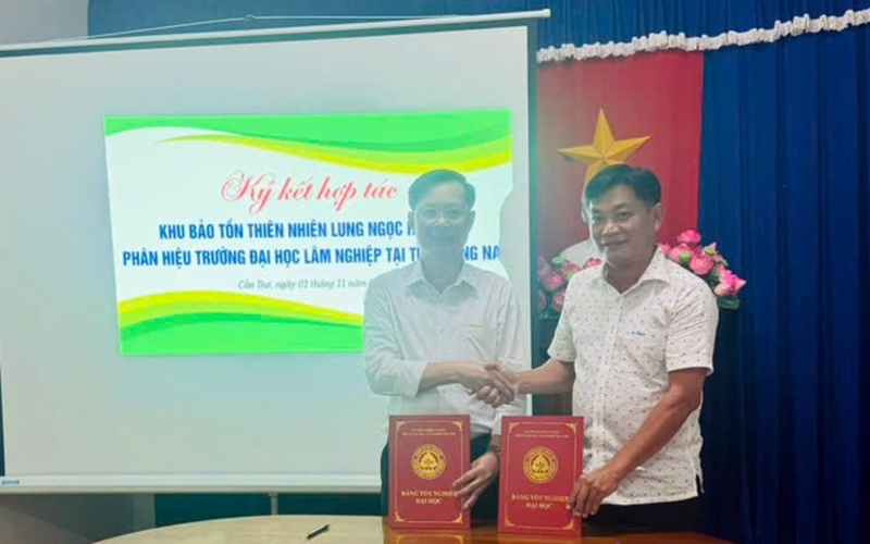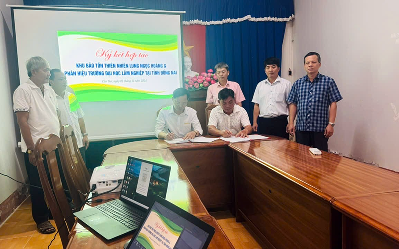 Đại diện hai đơn vị tiến hành ký kết và trao Biên bản hợp tác giữa Phân hiệu trường Đại học Lâm nghiệp tại tỉnh Đồng Nai và Khu Bảo tồn thiên nhiên Lung Ngọc Hoàng giai đoạn 2025 – 2030. Buổi làm việc thành công tốt đẹp chúc cho sự hợp tác giữa hai đơn vị luôn chặt chẽ và đạt được nhiều thành tựu./.