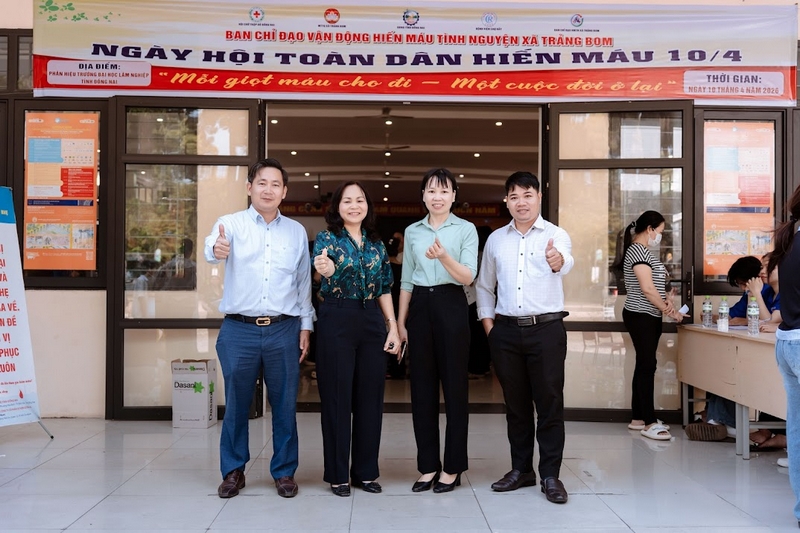 Sáng ngày 10/4/2026, tại Hội trường A3, Trường Đại học Lâm nghiệp Phân hiệu tỉnh Đồng Nai (VNUF2) phối hợp với Ban vận động hiến máu xã Trảng Bom tổ chức Ngày hội toàn dân hiến máu 10/04. Chương trình diễn ra trong không khí sôi nổi, thu hút đông đảo cán bộ, giảng viên, sinh viên, học sinh và các tình nguyện viên tham gia.
