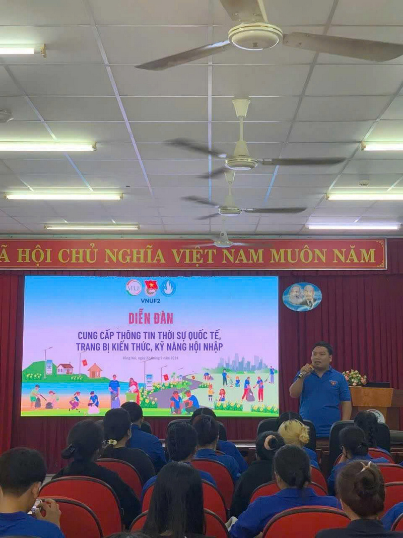 Ngày 22/9/2024, Đoàn Thanh niên phối hợp cùng Hội Sinh viên Phân hiệu trường Đại học Phân hiệu Lâm nghiệp tại Đồng Nai đã tổ chức Diễn đàn cung cấp thông tin thời sự quốc tế, trang bị kiến thức, kỹ năng hội nhập cho Đoàn viên, Hội viên, sinh viên nhà trường. Tham dự chương trình có Đ/c Phan Thanh Trọng – Phó Chủ tịch Hội Sinh viên trường, cùng các đồng chí trong Ban Thường vụ Đoàn trường, Ban Thư ký Hội Sinh viên trường và hơn 50 đoàn viên, Hội viên, sinh viên tiêu biểu.